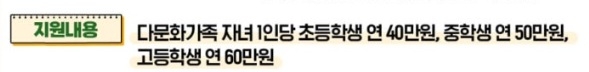 | 지원 대상 | 기준중위소득 100% 이하 다문화가족의 7~18세 자녀 (교육급여 수급자 제외) |